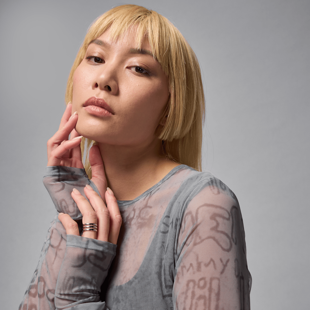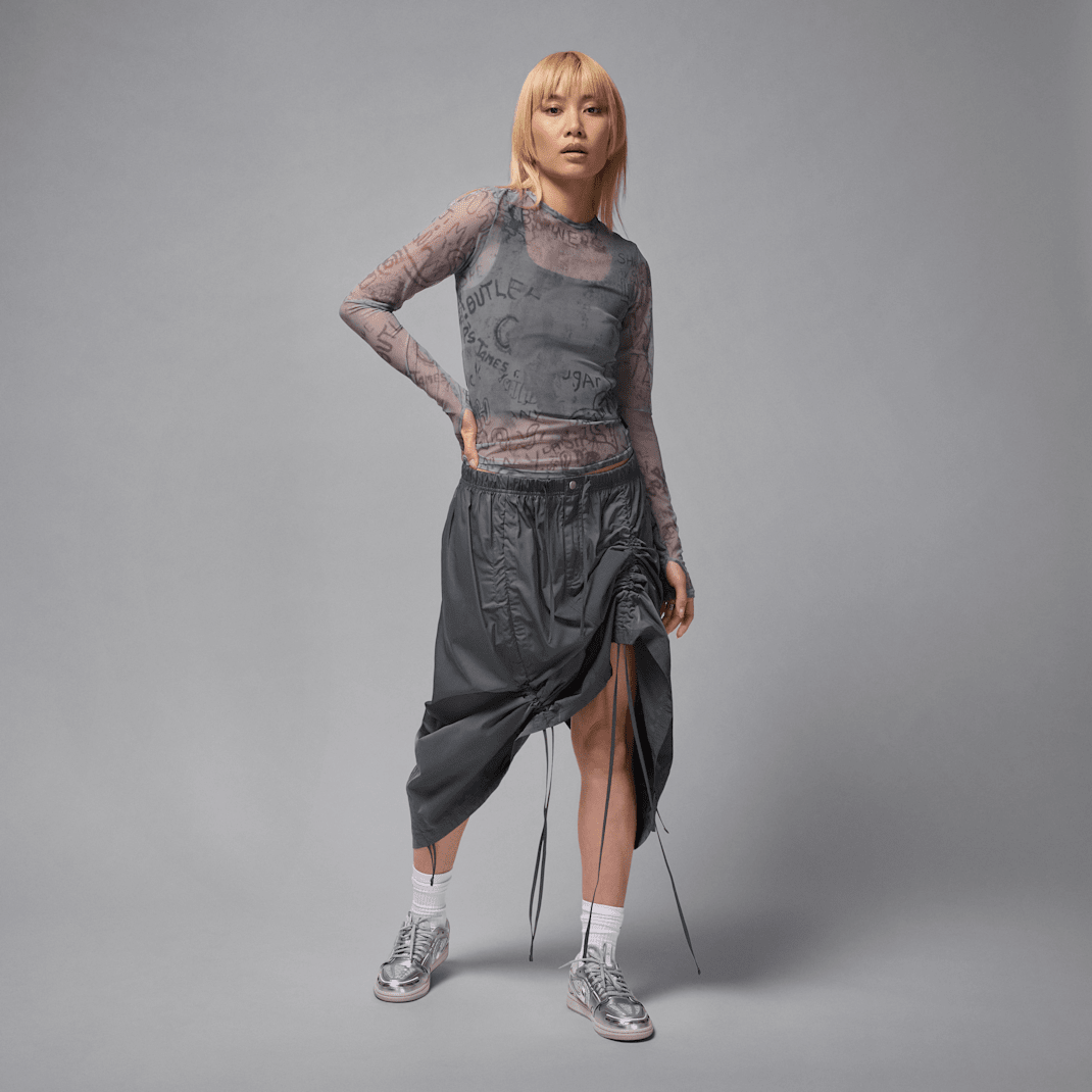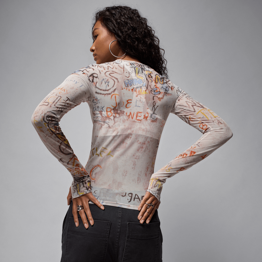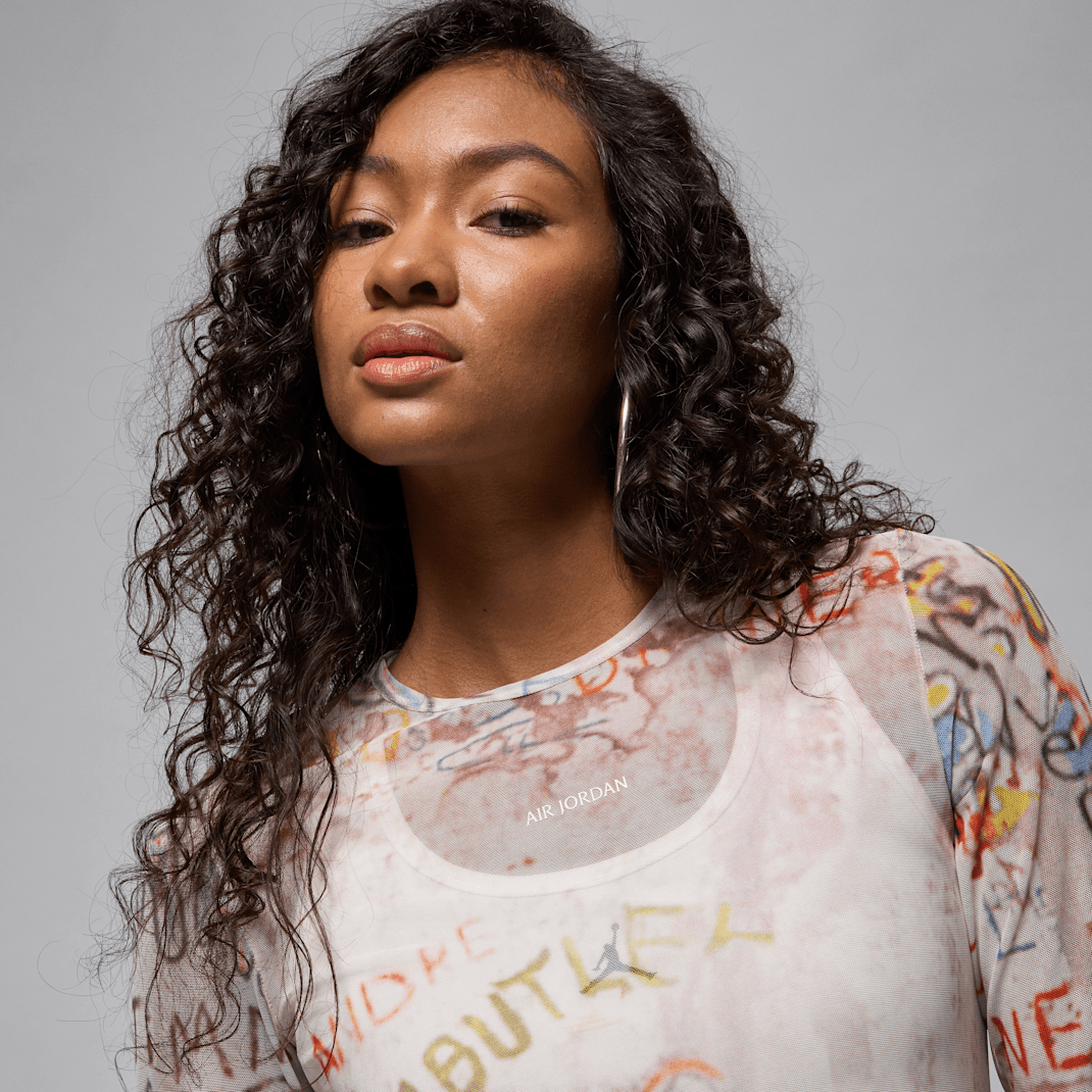 Air Jordan is where craftsmanship meets Jordan DNA. See-through mesh and an allover print inspired by an iconic MJ image add depth and dimension to this stretchy, long-sleeve top.