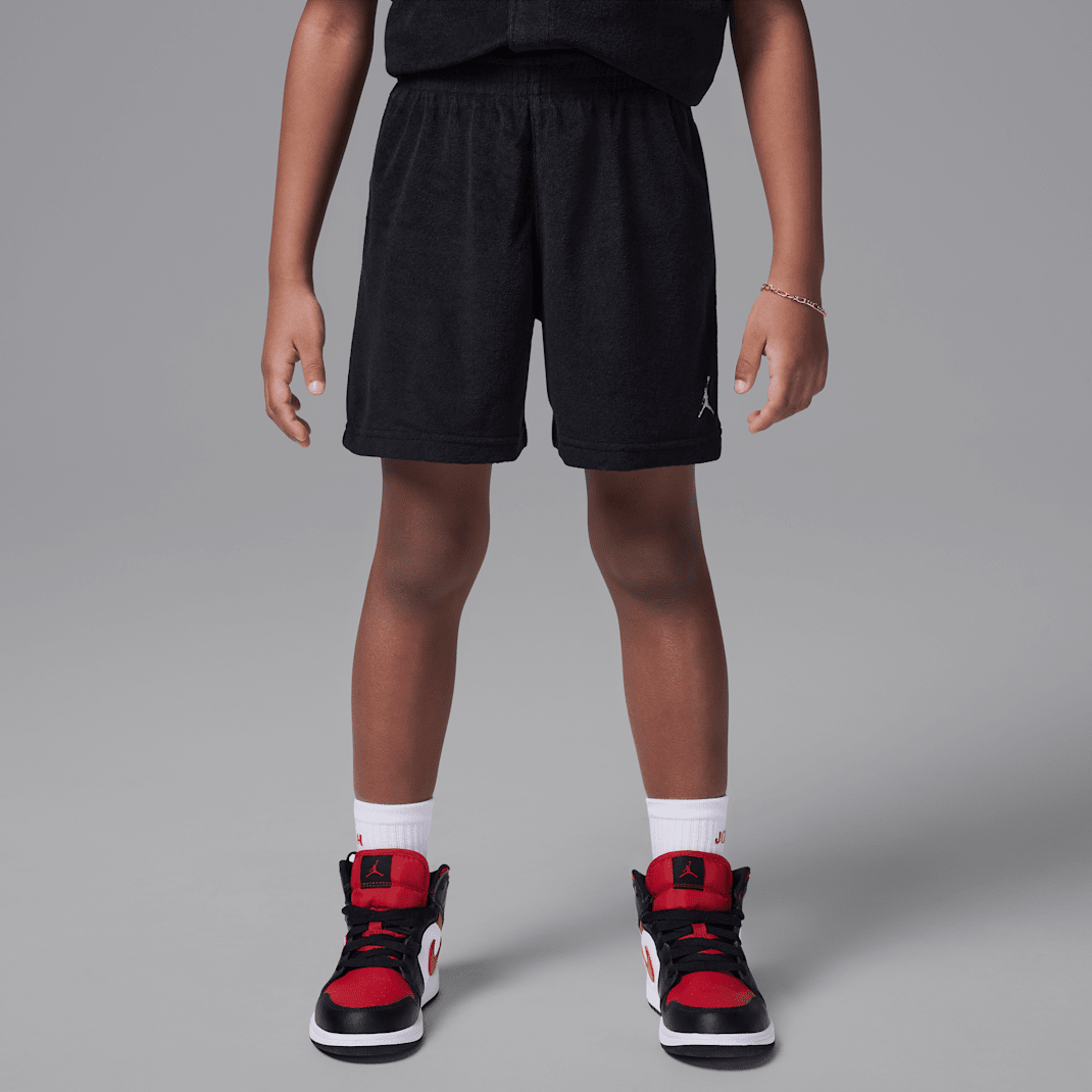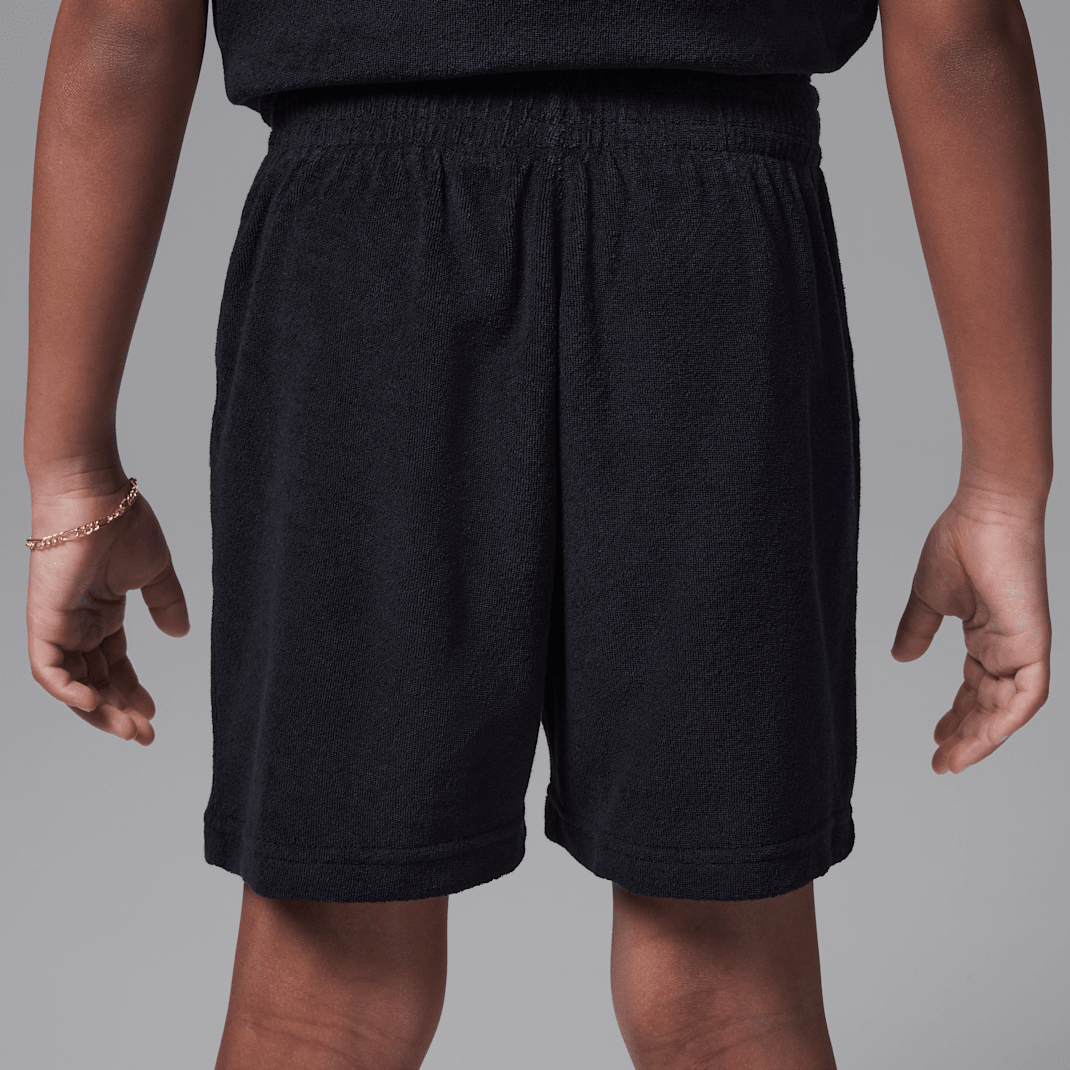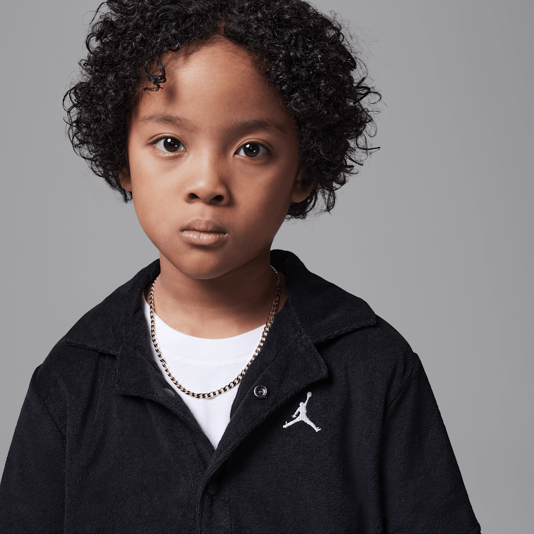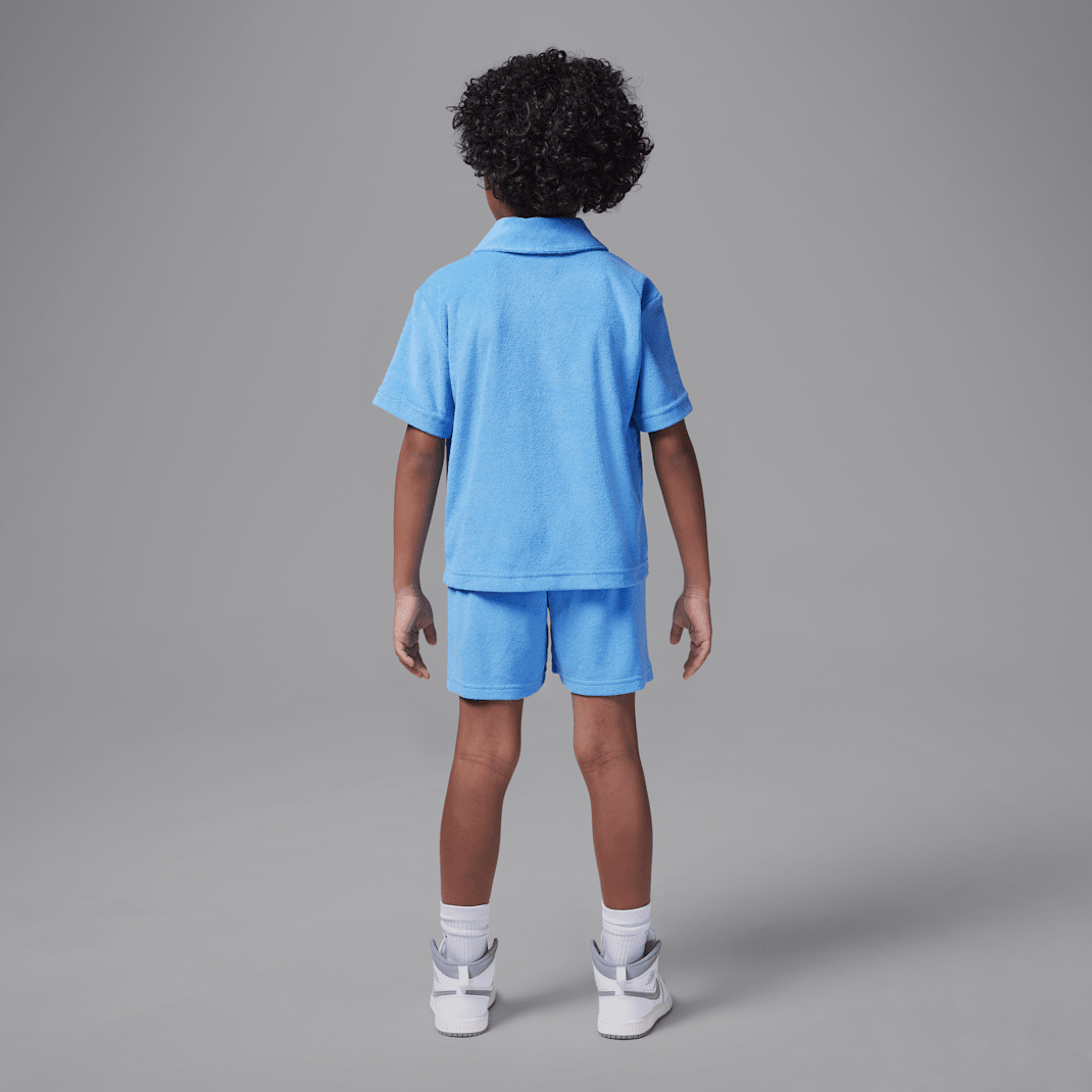 Made of blended cotton French terry, this coordinated 2-piece set is a beachy, laid-back fit designed for relaxed, warm weather days. The button-up top features Jumpman logo embroidery, and has a regular cut roomy enough to layer over a tank or tee. The shorts also feature logo embroidery and have a stretch waistband for a comfy fit kiddos can play freely in.