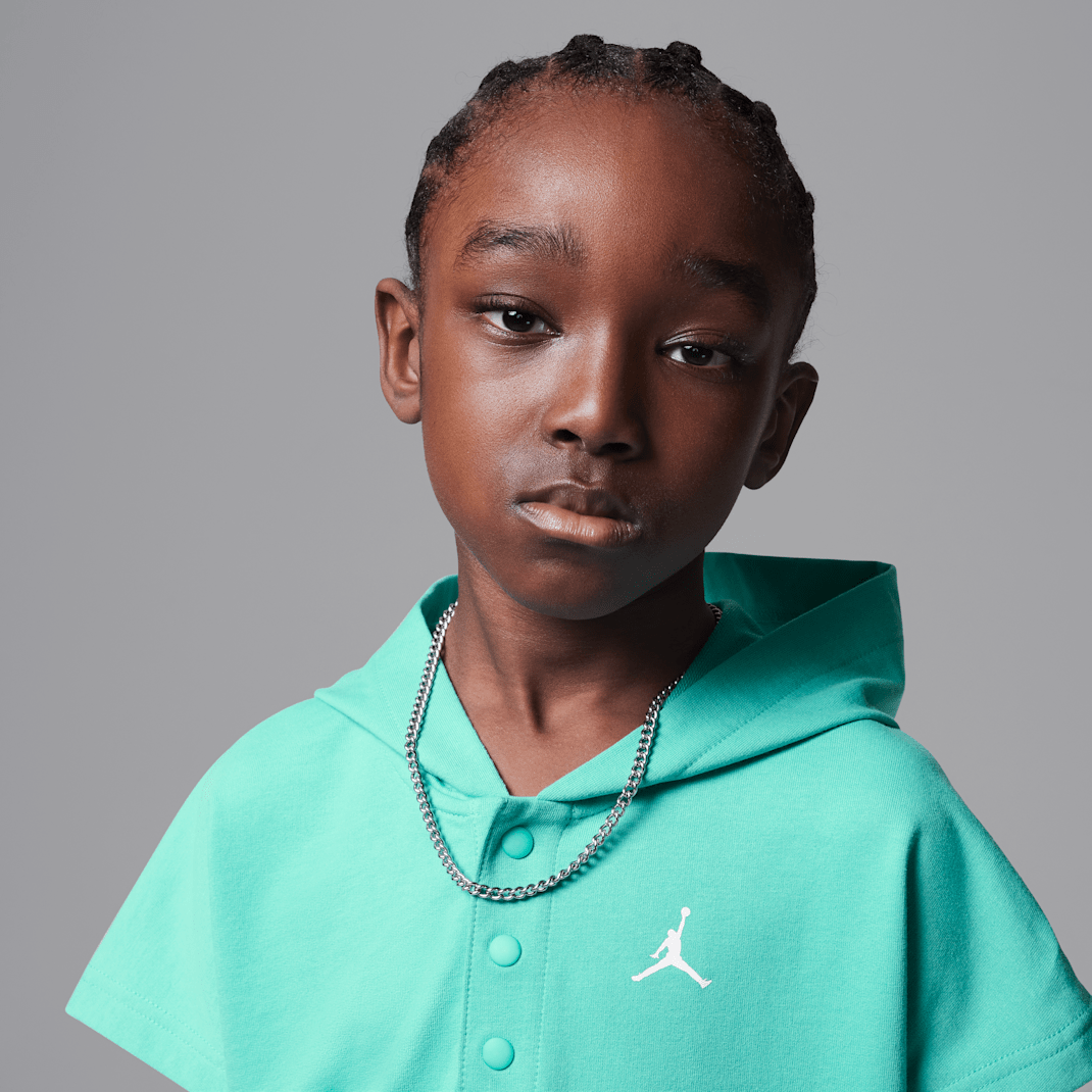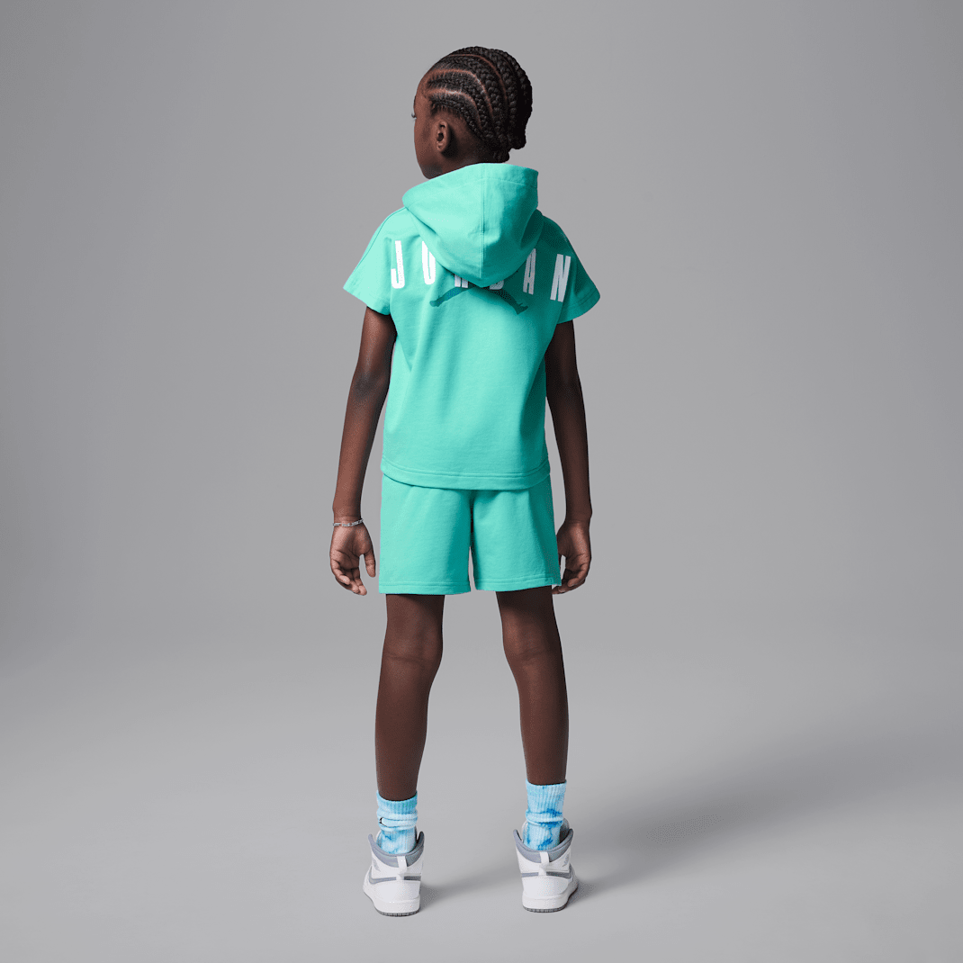 Made of cotton/poly French terry, this 2-piece set is an easy way to dress your little one in coordinated, warm weather style. The dolman hoodie has a roomy cut with a henley neckline that makes layering over a tank or tee easy, and the matching shorts have a stretch waistband for a comfy fit.