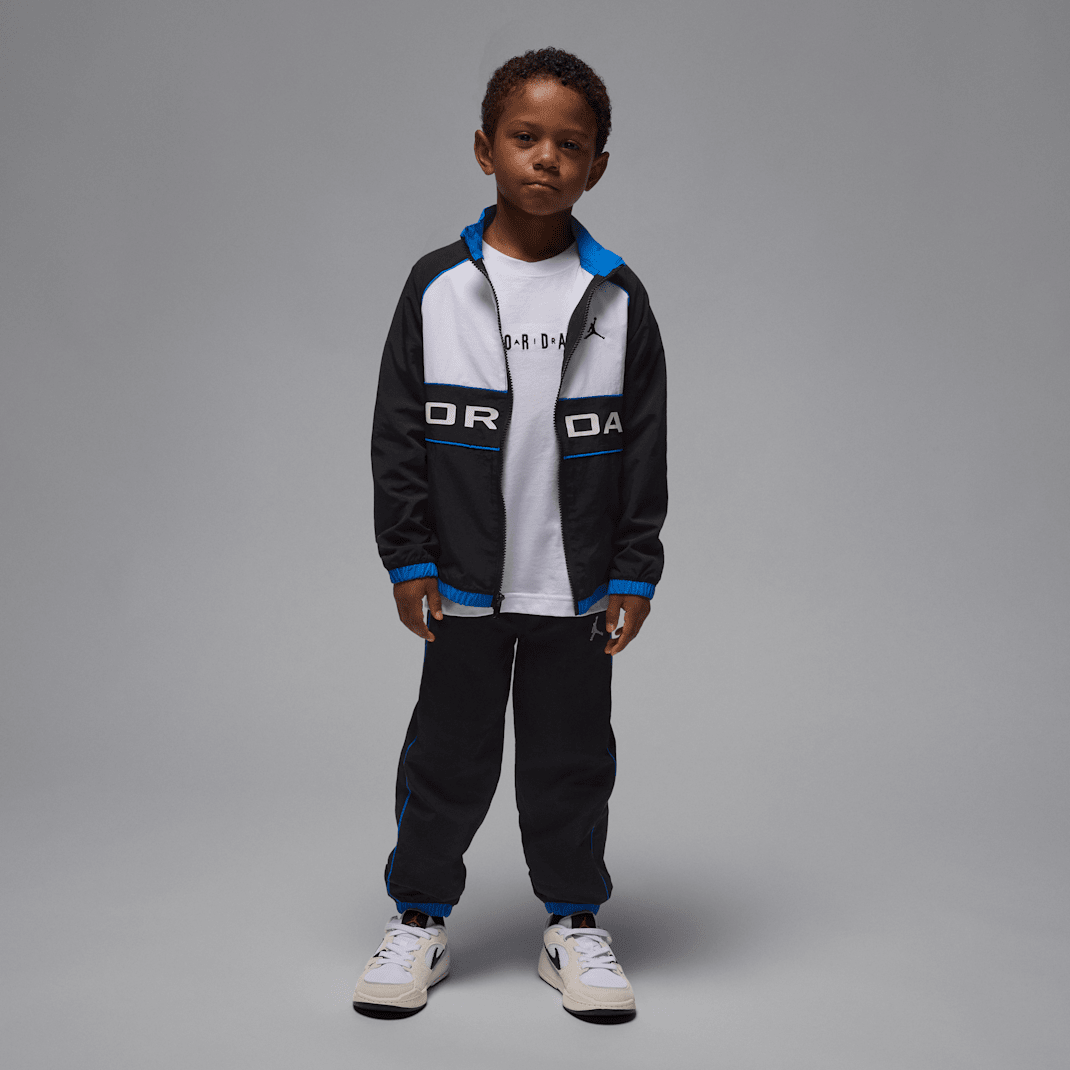 Made of lightweight nylon fabric, this 2-piece set is a lightweight version of the classic tracksuit. The jacket features colorblocked detailing, the roomy cut and full-zip closure make layering easy, and the ribbed cuffs and hem create a secure fit that stands up to light and moderate winds. The matching pants have a stretch waistband for a comfy fit and tapered legs that provide a secure, cozy feel. Pair with any Jordan tank or tee for a completed look.