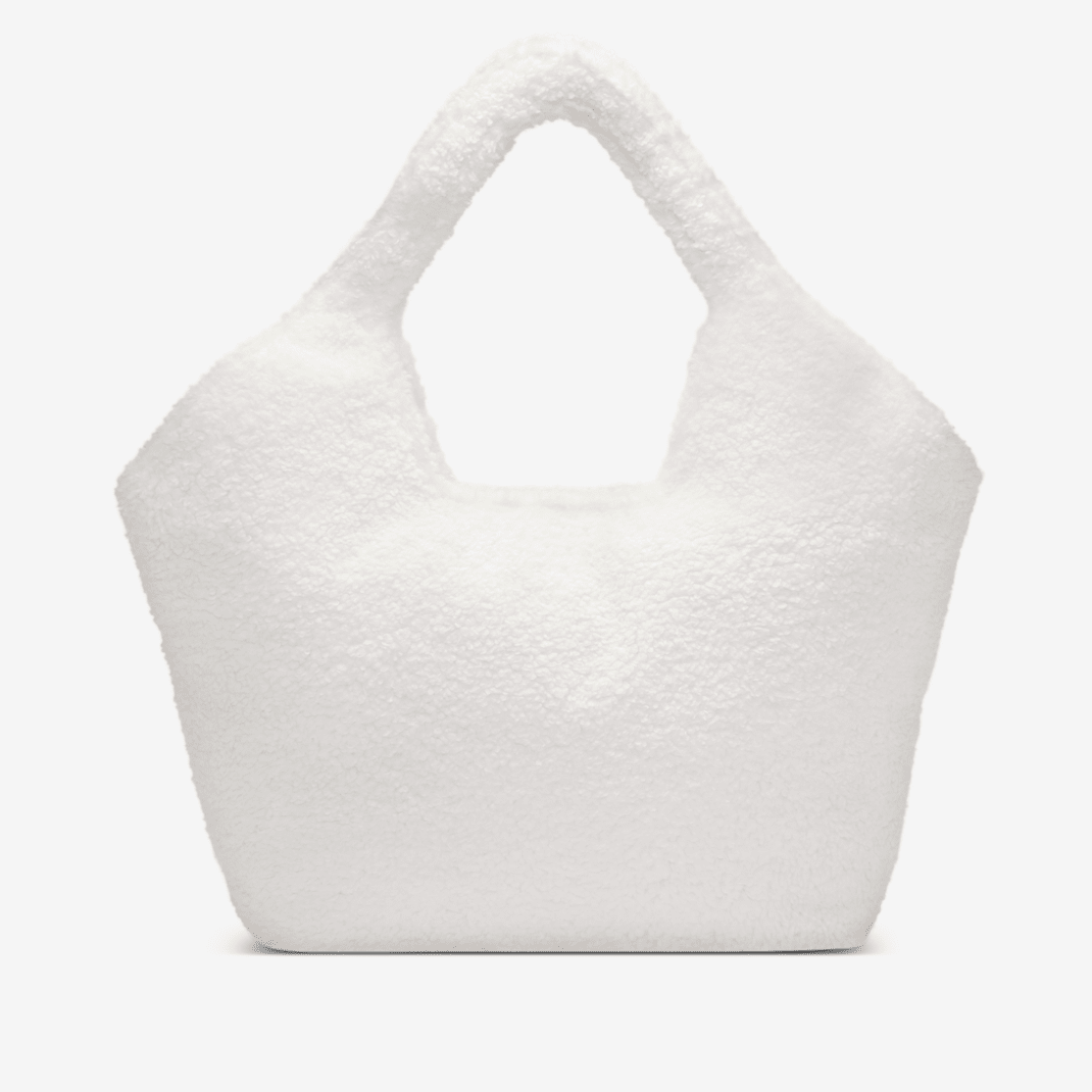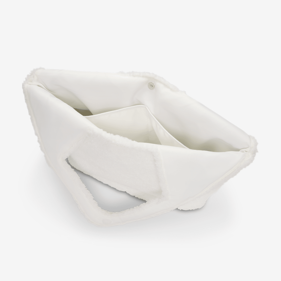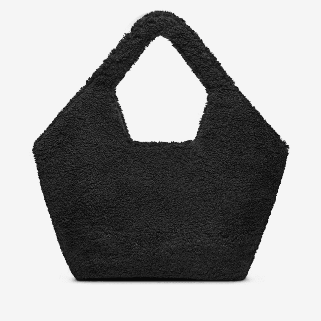 Made of plush high-pile fleece fabric in a unique pentagon shape, this statement tote bag will elevate almost any fit. The spacious main compartment has hidden magnetized snap closures, multiple pockets inside to help you keep your things organized, and the faux leather bottom panel has protective metal feet to help prolong the life of the bag.