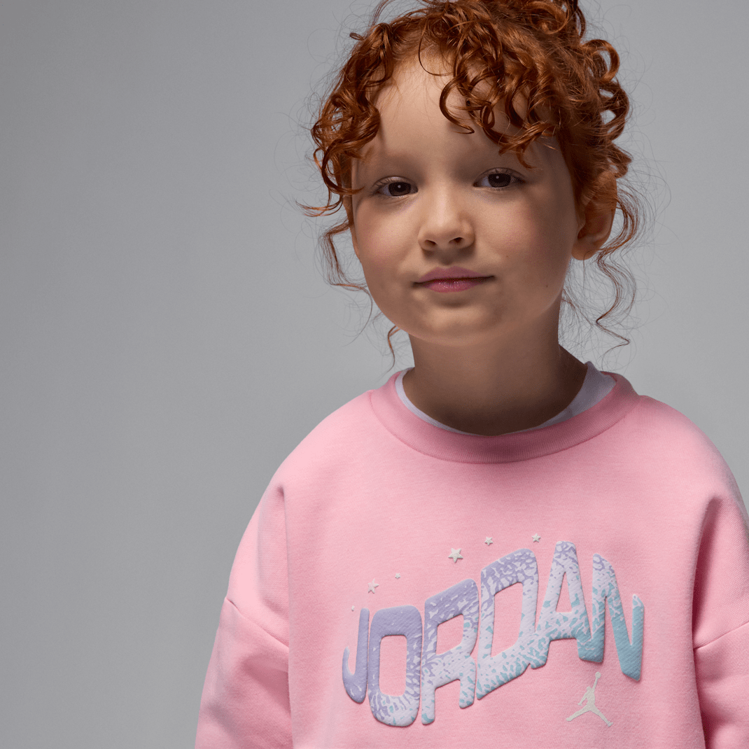 Dress smaller ballers-to-be in this two-piece set, which is made of blended cotton fleece that feels smooth on the outside and soft on the inside. The roomy crew top has dropped shoulders that relax the fit and an elasticized bubble hem. The matching pants have a stretchy waistband for a comfy fit and tapered legs for a cozy, secure feel that spotlights your child’s Jordans.