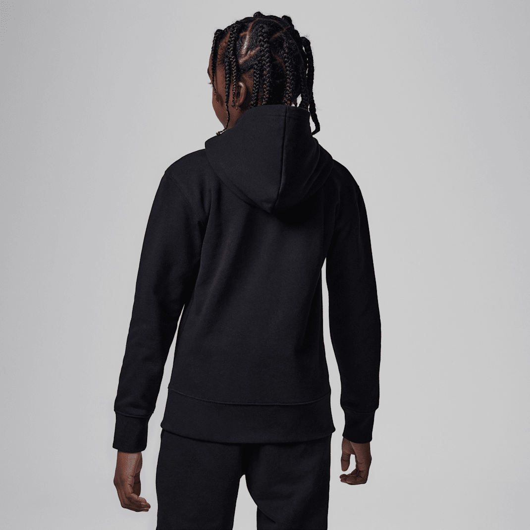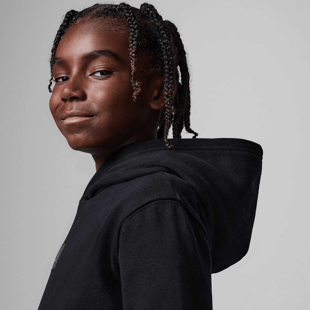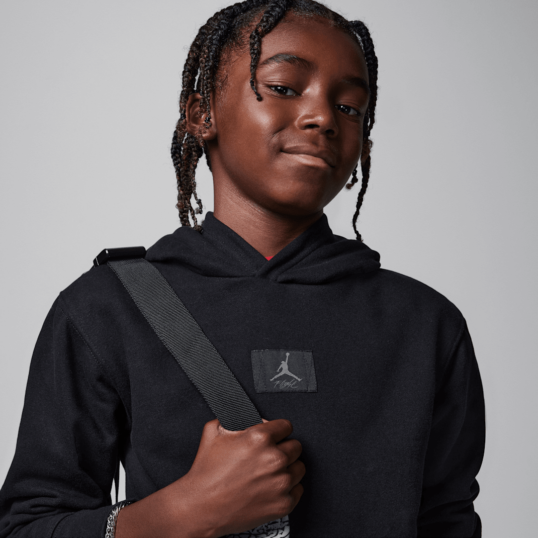 Rep the Brand of Flight in this hoodie, which features the Jumpman Flight script logo patch. It’s made of cotton/poly fleece that feels smooth on the outside and soft on the inside for a cozy feel. Dropped shoulders create a relaxed fit, the kangaroo pocket can be used to stash small items or help keep your hands toasty and the ribbed cuffs and hem help retain warmth. Pair with the Jordan Jumpman MJ Flight Fleece Pants for a coordinated look.