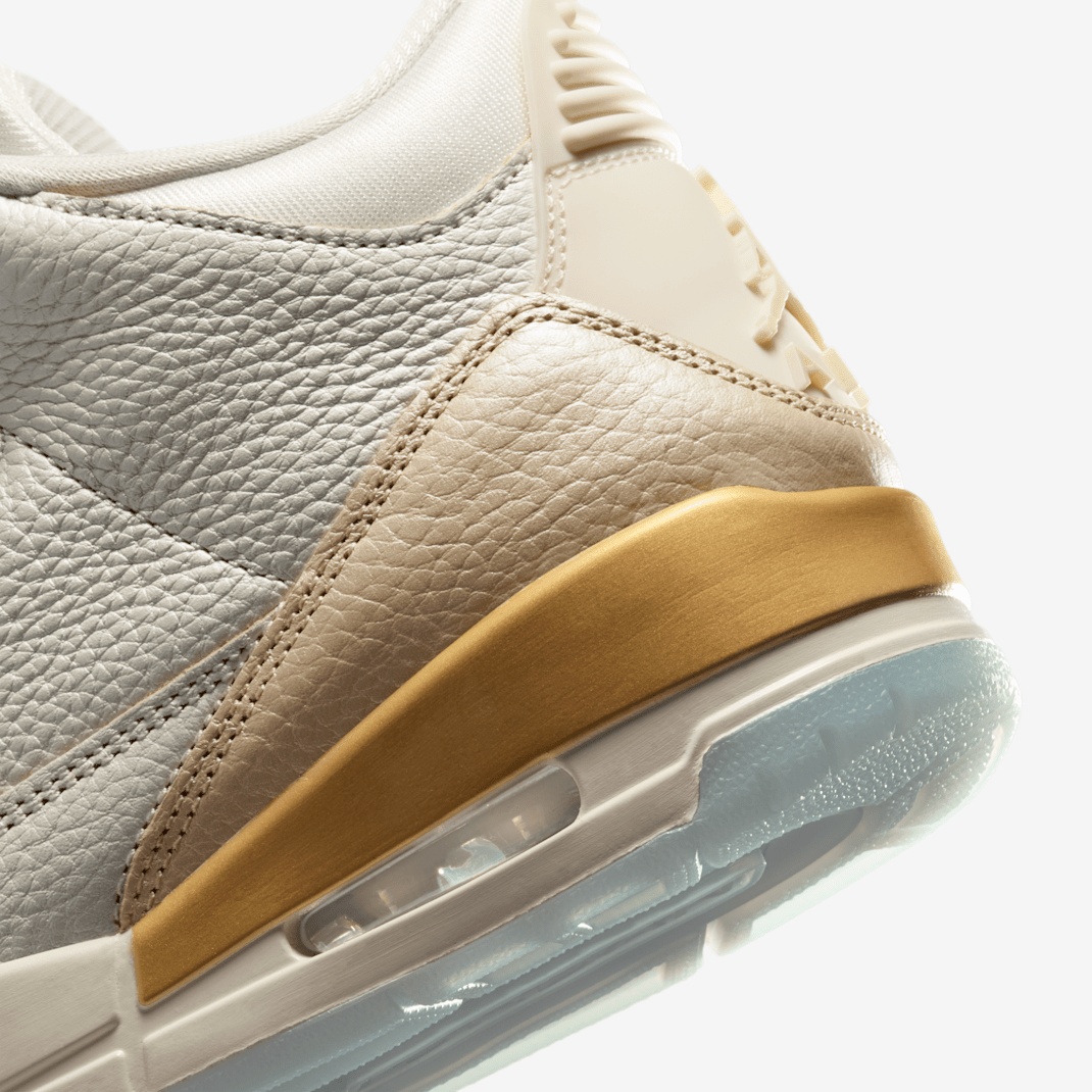 Sneaker royalty meets modern luxury. Rich suede overlays replace the traditional elephant print, creating a smooth rendition of MJ’s iconic AJ3. The Sail and Pale Ivory leather upper create an understated base, letting the polished Metallic Gold accents shine. An icy blue outsole finishes off this premium shoe with an extra touch of elegance.