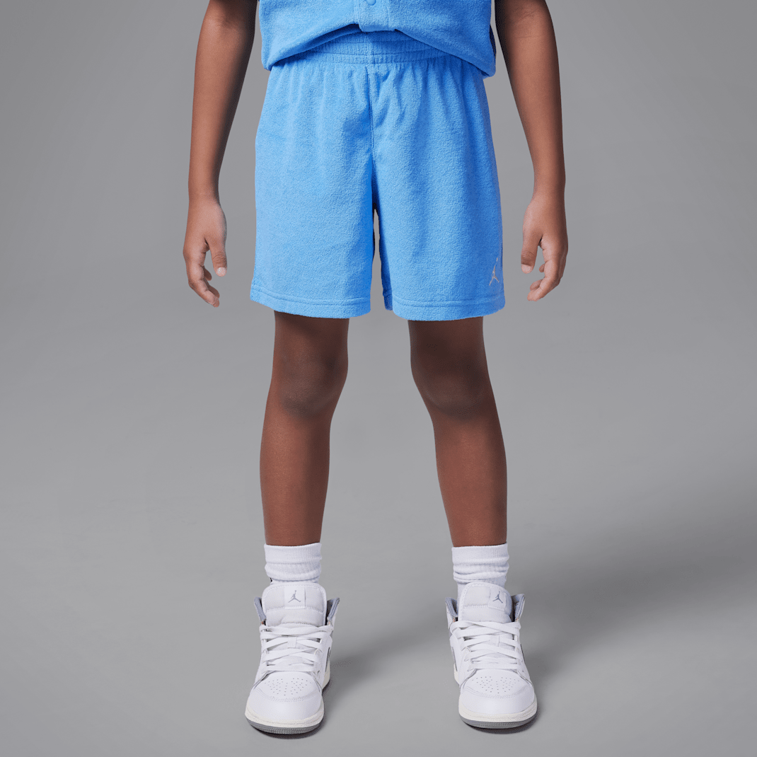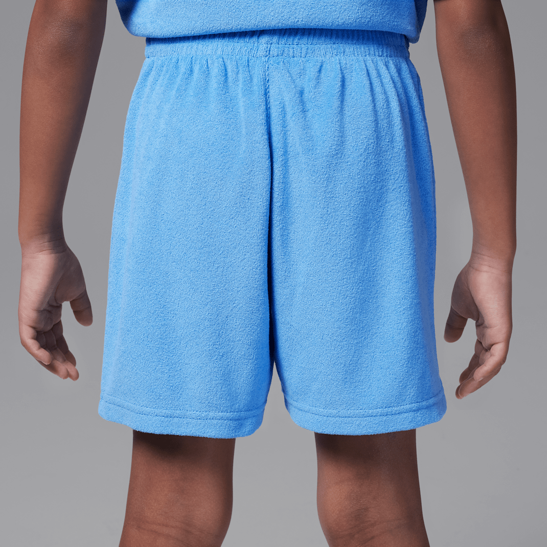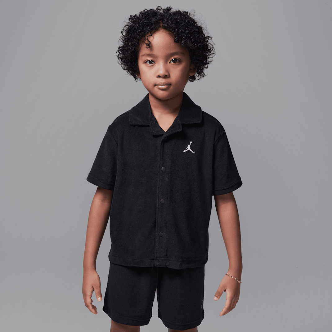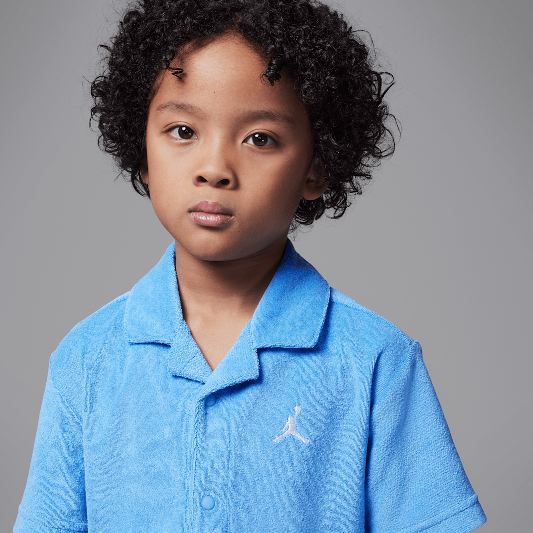 Made of blended cotton French terry, this coordinated 2-piece set is a beachy, laid-back fit designed for relaxed, warm weather days. The button-up top features Jumpman logo embroidery, and has a regular cut roomy enough to layer over a tank or tee. The shorts also feature logo embroidery and have a stretch waistband for a comfy fit kiddos can play freely in.