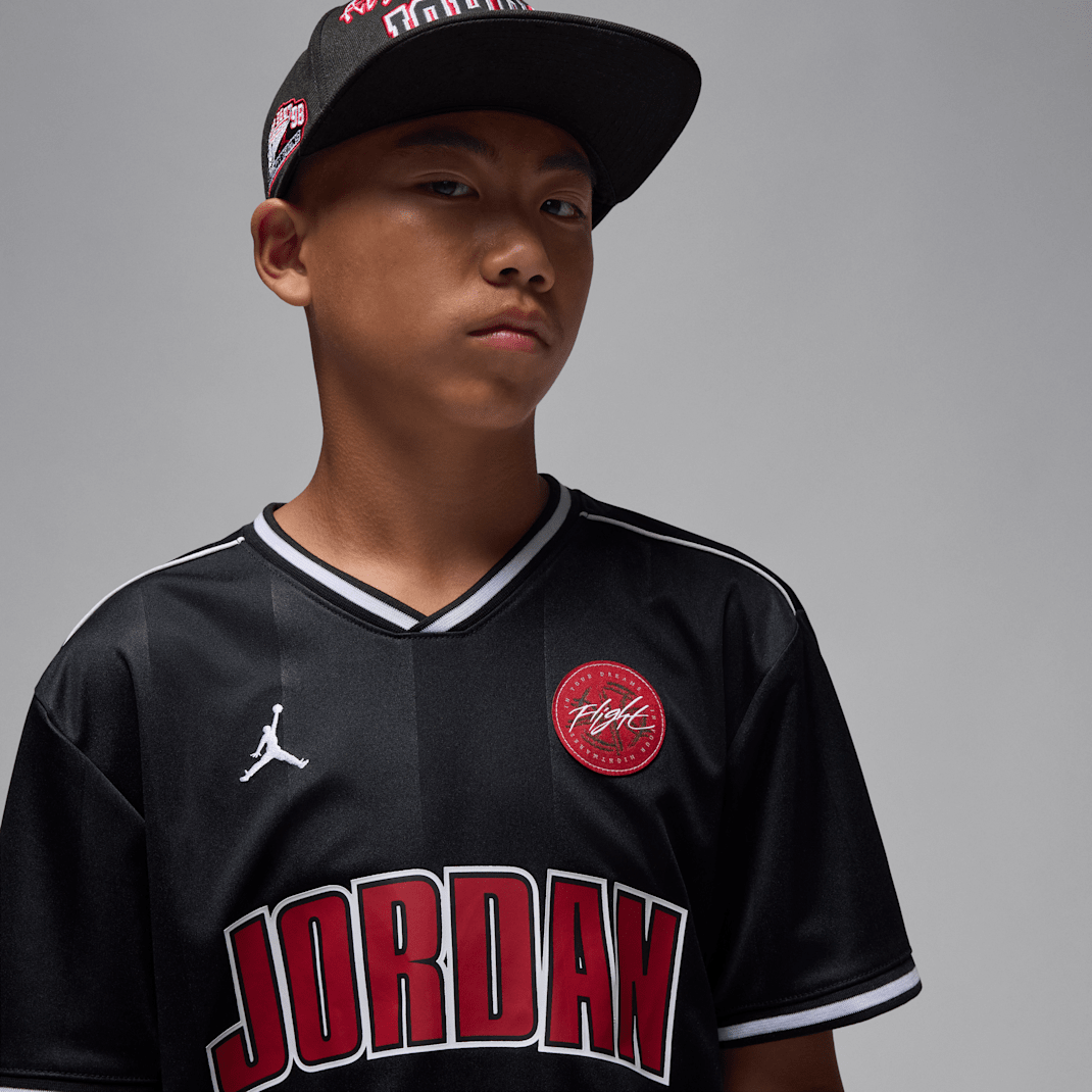 Designed in the style of a soccer jersey, this breathable top looks great with about any Jordan bottom or your favorite pair of jeans. It features embroidered and patch logo detailing and is made of poly knit fabric with an allover subtle sheen, a smooth feel, and dropped shoulders that relax the fit.